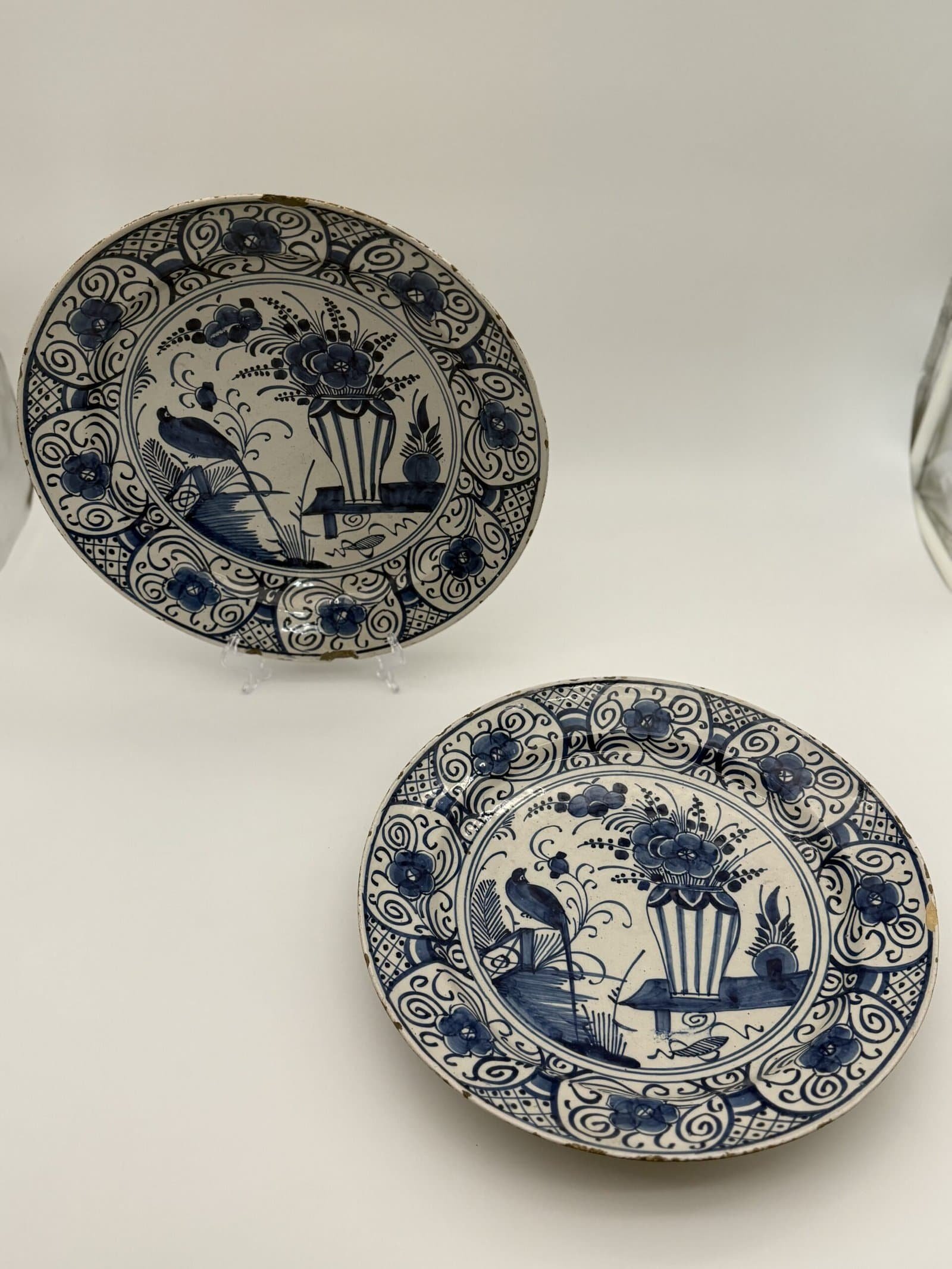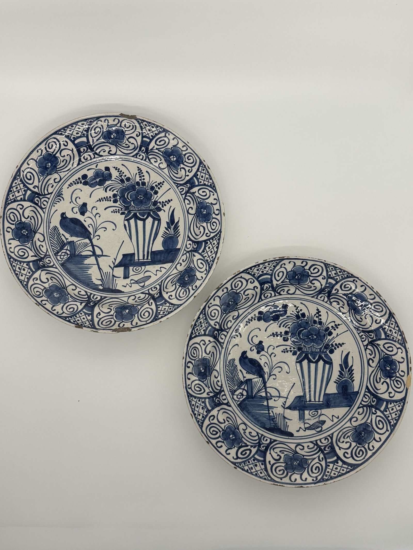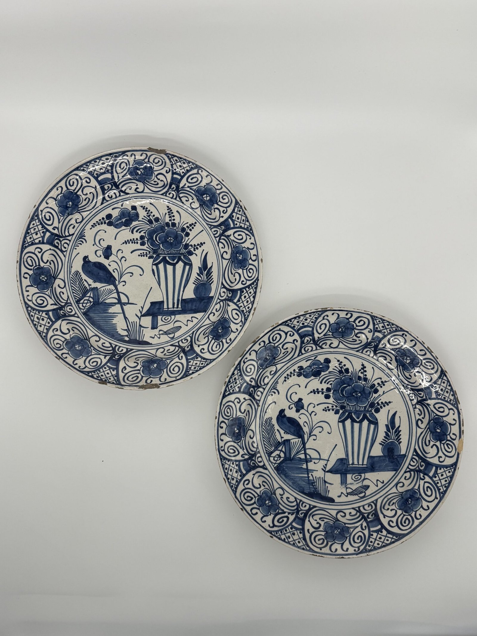 Beautiful matched pair of mid 18th century Delft blue and white chargers, painted in the Chinoiserie stlye with central panel of birds amongst foliage, within borders painted with precious objects and flowers. Wonderful deep cobalt colouring and tin glazing both still very vibrant. Dimensions: 33.5cm in diameterGood condition; some edge chipping as typically seen on Delft ware from this period