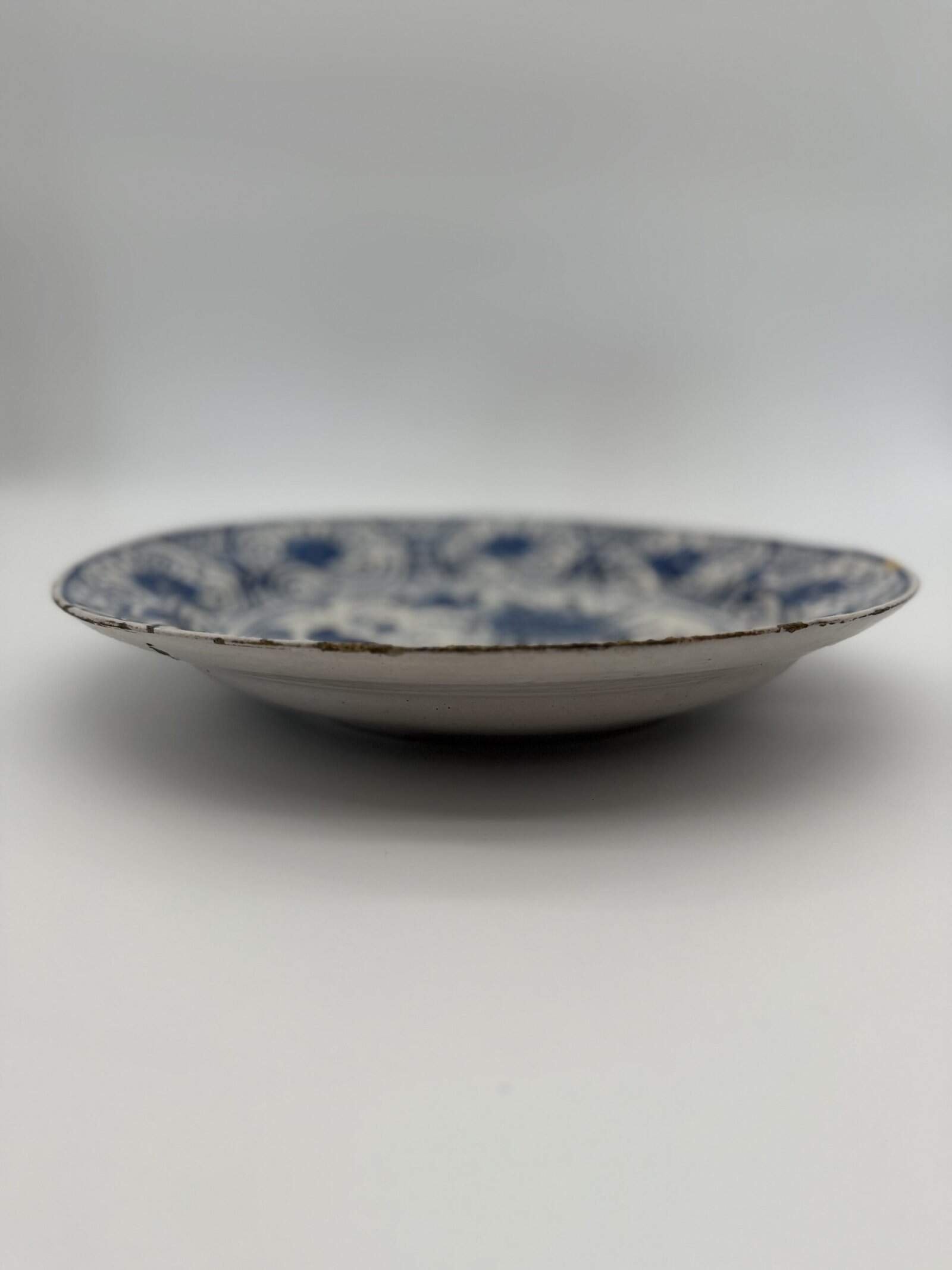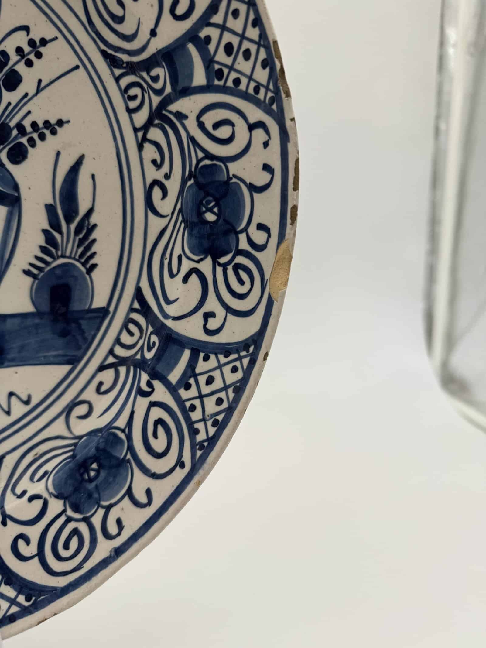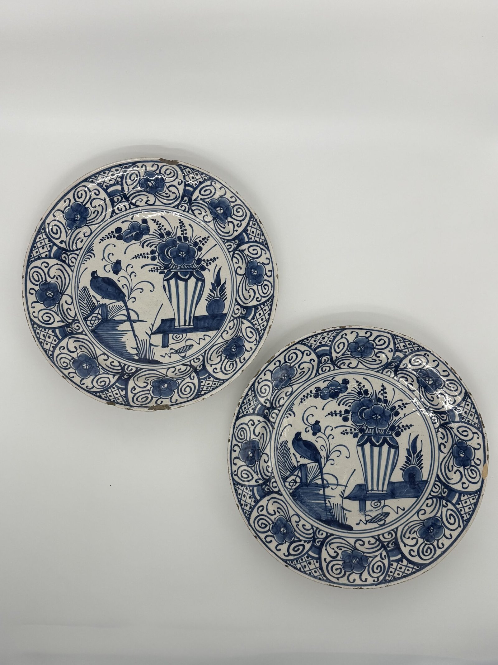 Beautiful matched pair of mid 18th century Delft blue and white chargers, painted in the Chinoiserie stlye with central panel of birds amongst foliage, within borders painted with precious objects and flowers. Wonderful deep cobalt colouring and tin glazing both still very vibrant. Dimensions: 33.5cm in diameterGood condition; some edge chipping as typically seen on Delft ware from this period
