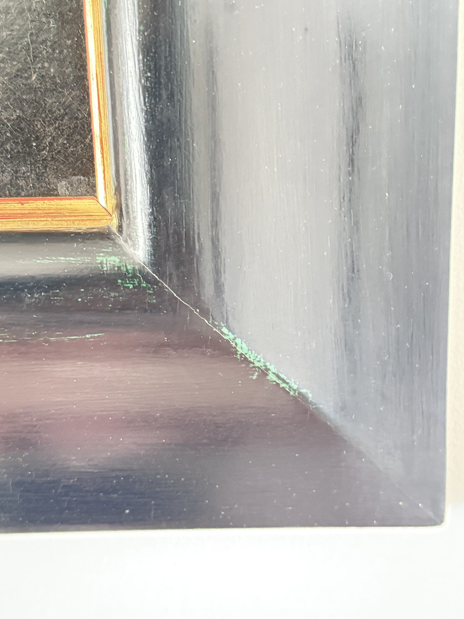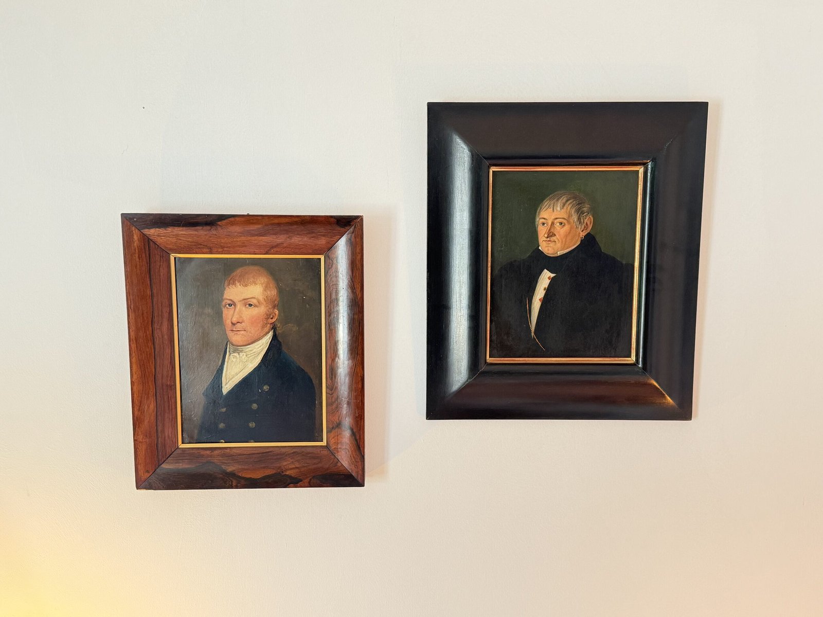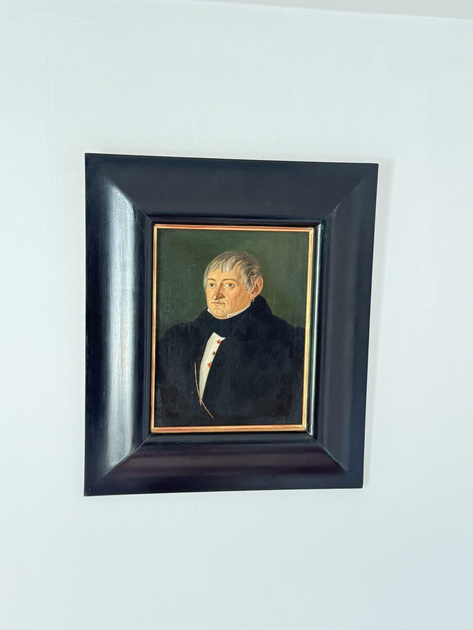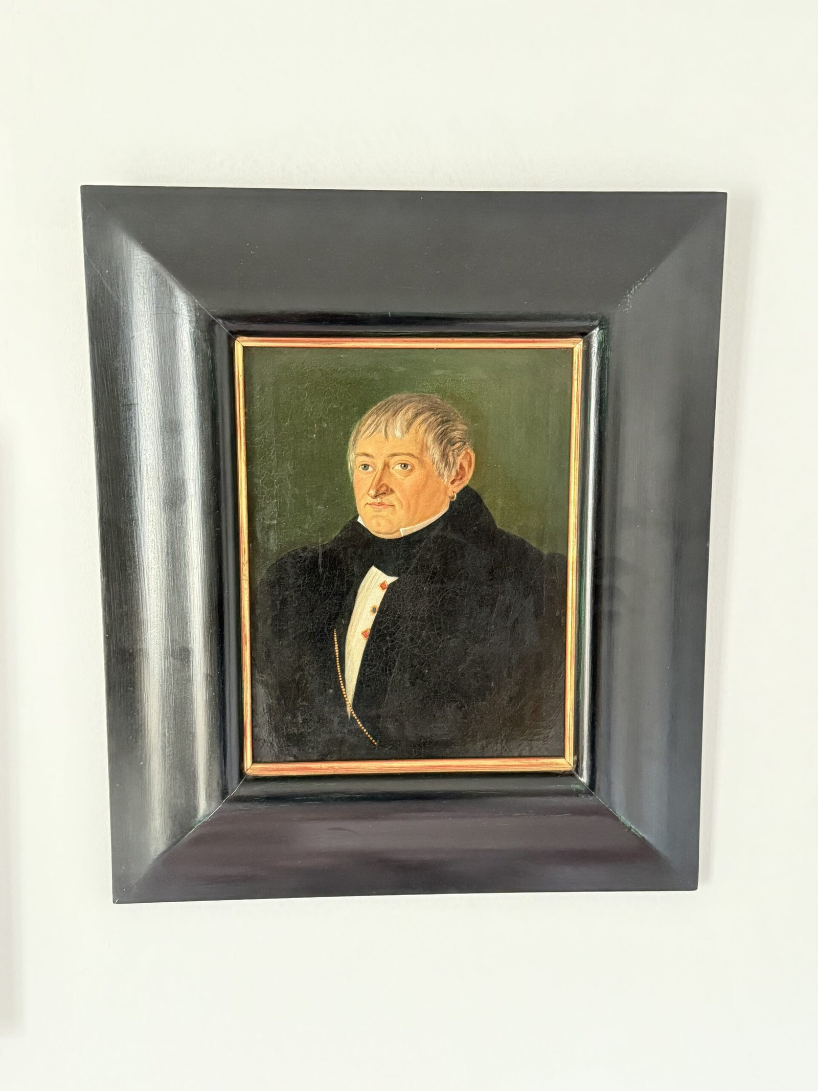 The second image is a unique oil on tin panel, which depicts a gentleman in formal Northern European dress. The magnificent detail indicates an early 19th-century origin. The elegant rosewood veneer frame enhances its sophisticated appeal, making it a true collector’s piece.