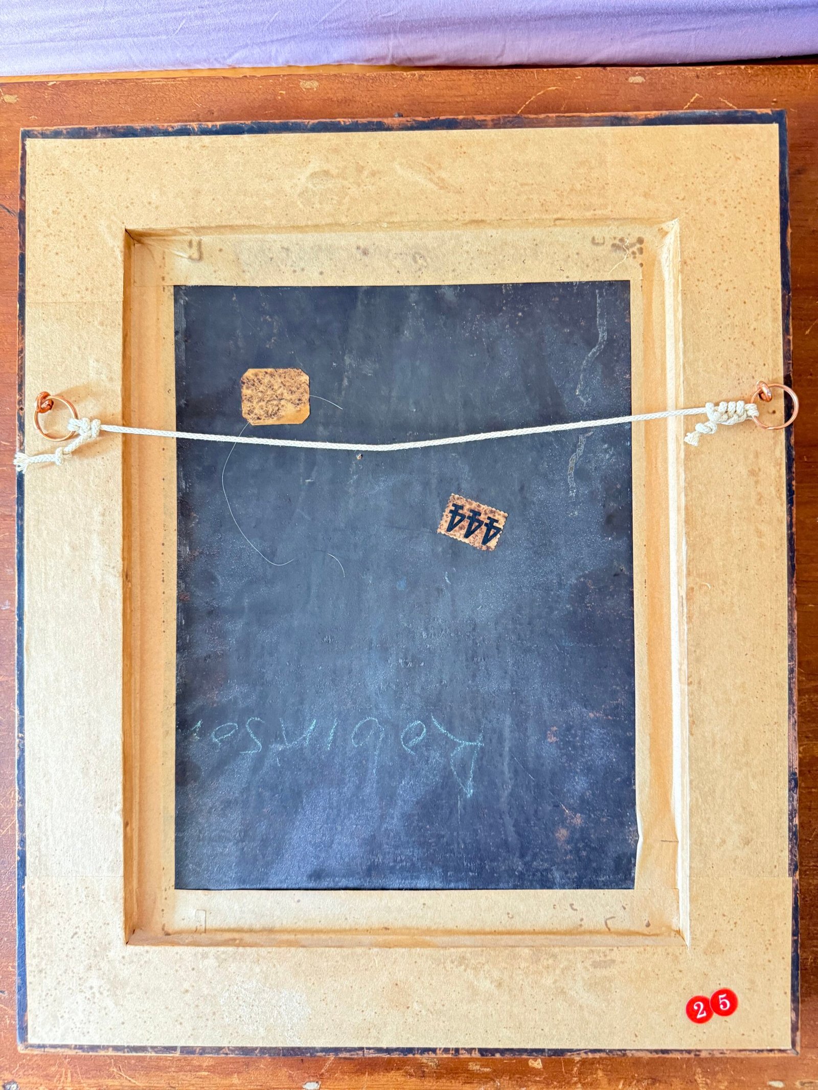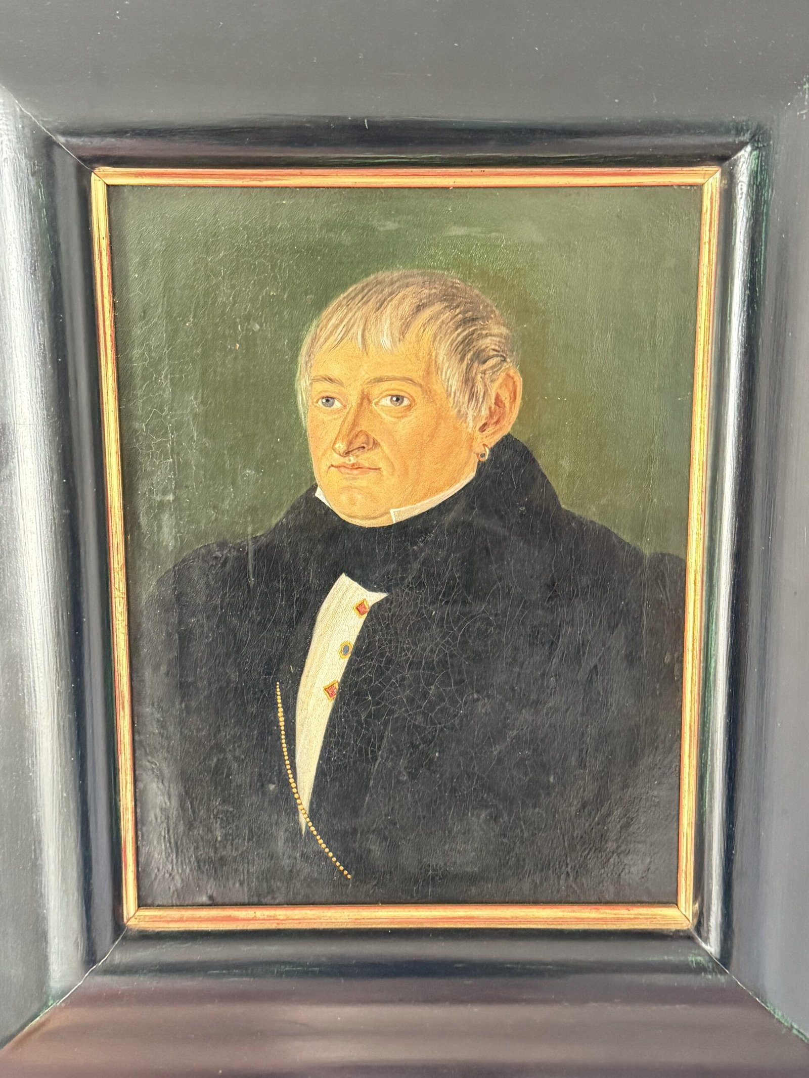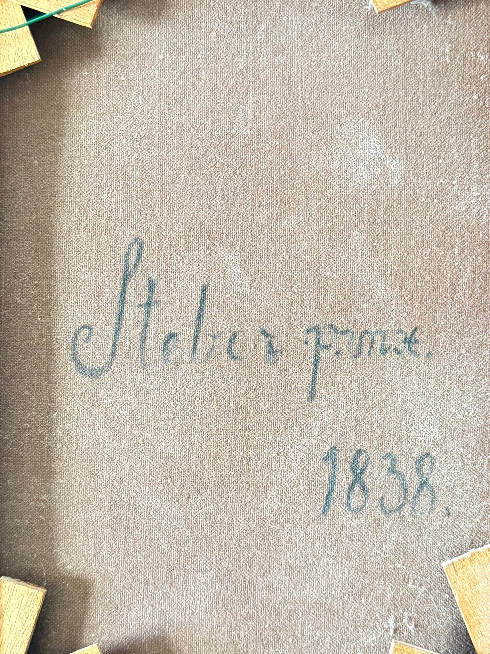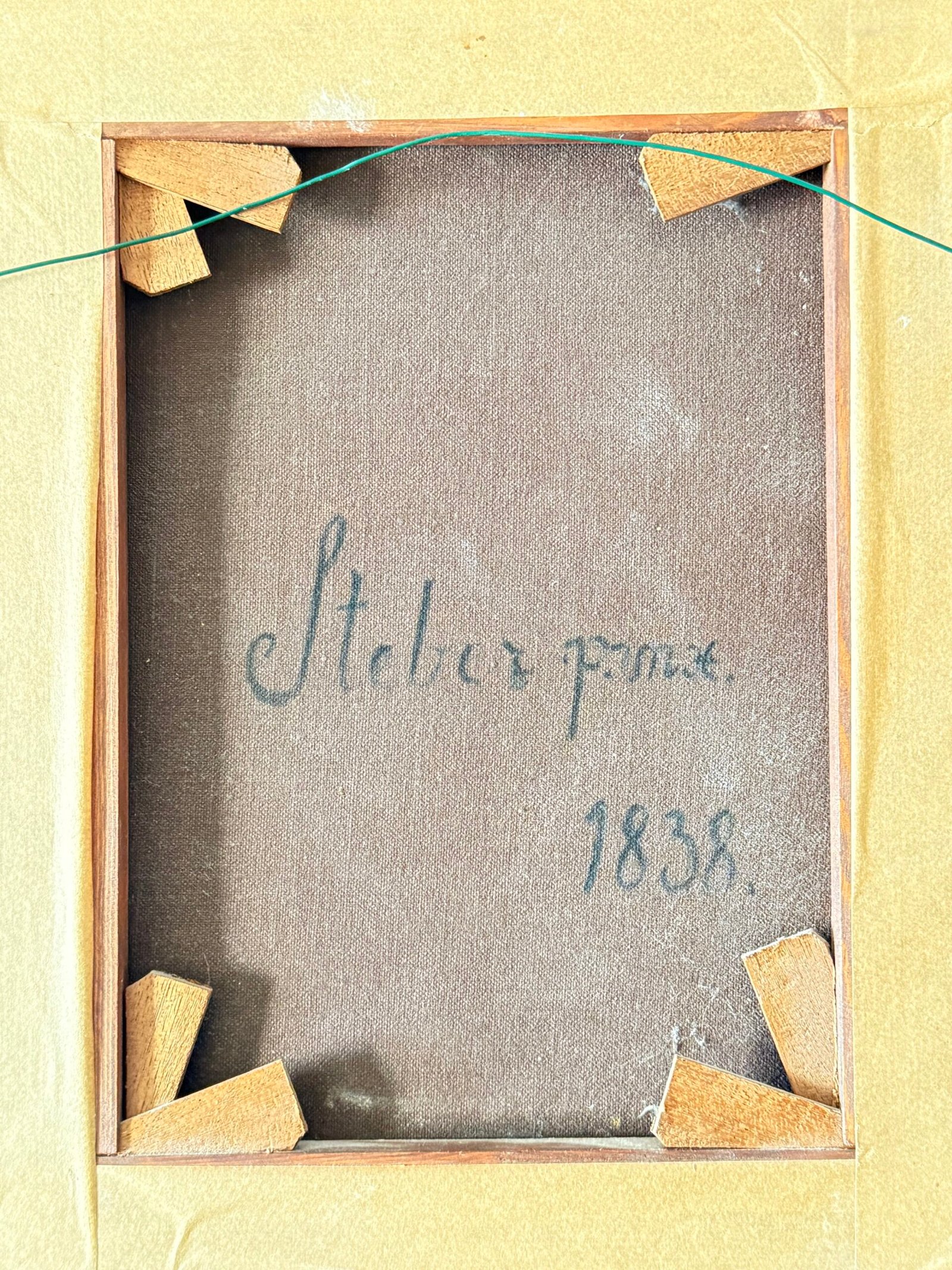 The first piece is an oil on canvas, possibly original European, possibly military or official in context. The rear "Stober Pinxit 1838" marking suggests a German, Austrian, or Swiss artist, as Latin inscriptions were common in these areas in the early 1800s. It is presented in an original Biedermeier ebonized wooden frame with a gold inner slip, consistent with early 19th-century craftsmanship.