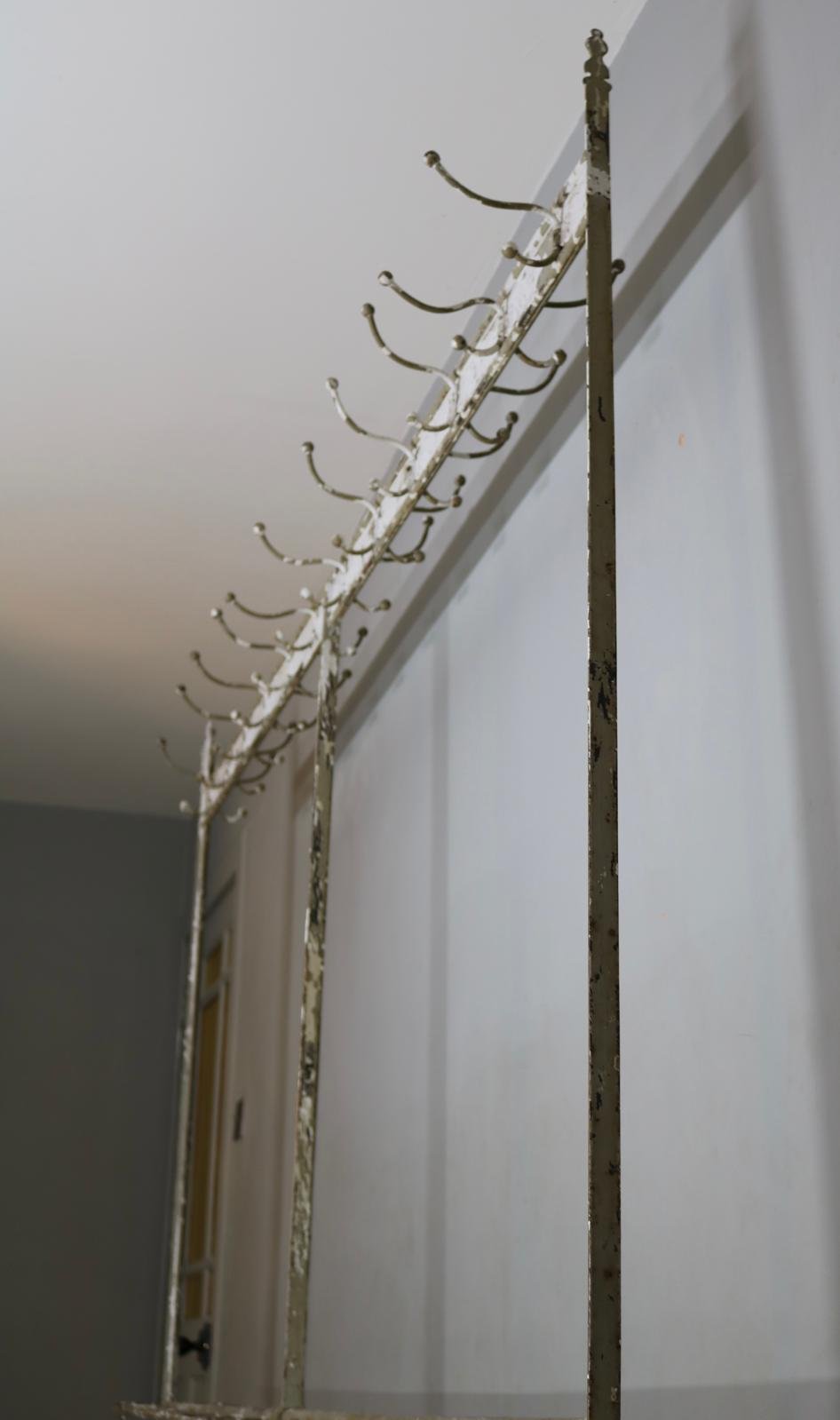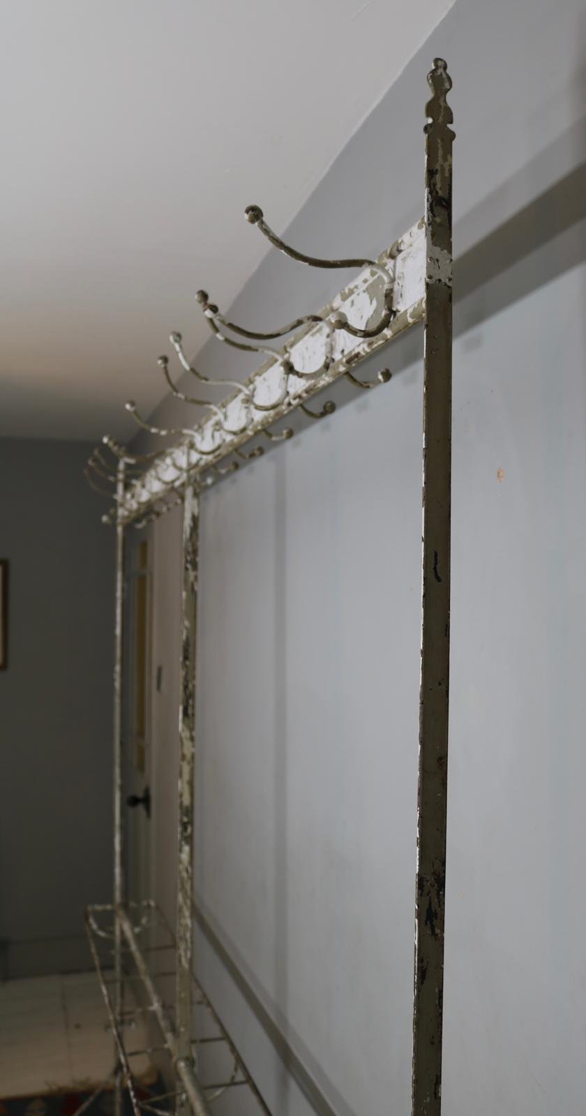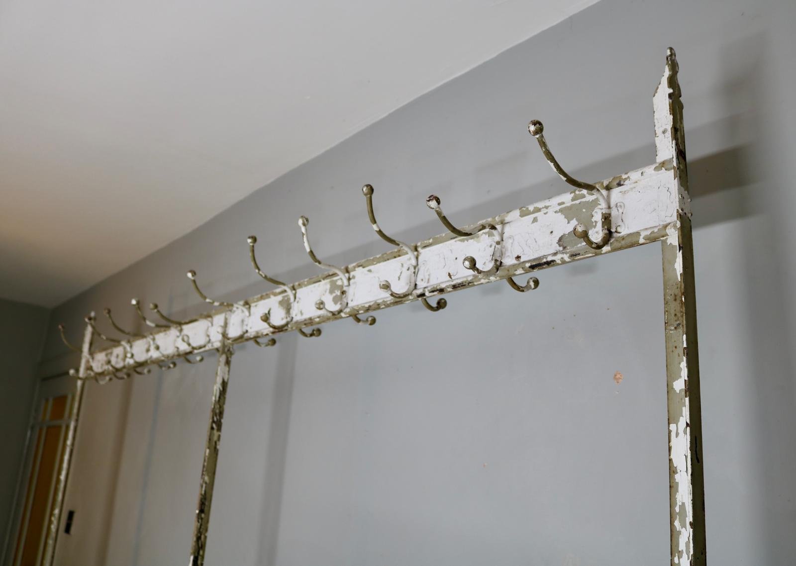 A one-of-a-kind antique hall stand from the late 19th or early 20th century, made of painted metal and featuring very large proportions. This stunning piece likely originates from Britain or France and was possibly used in a school, train station waiting room, or factory.