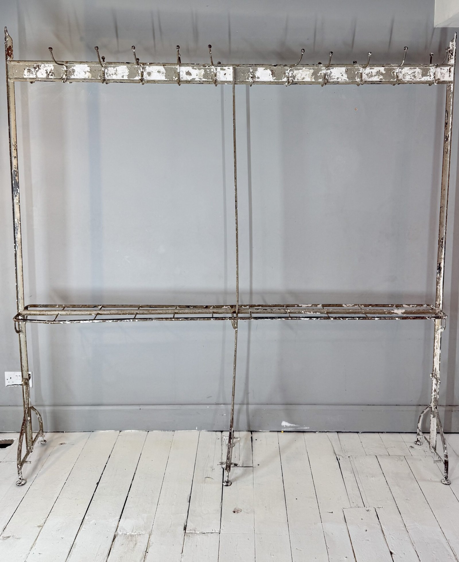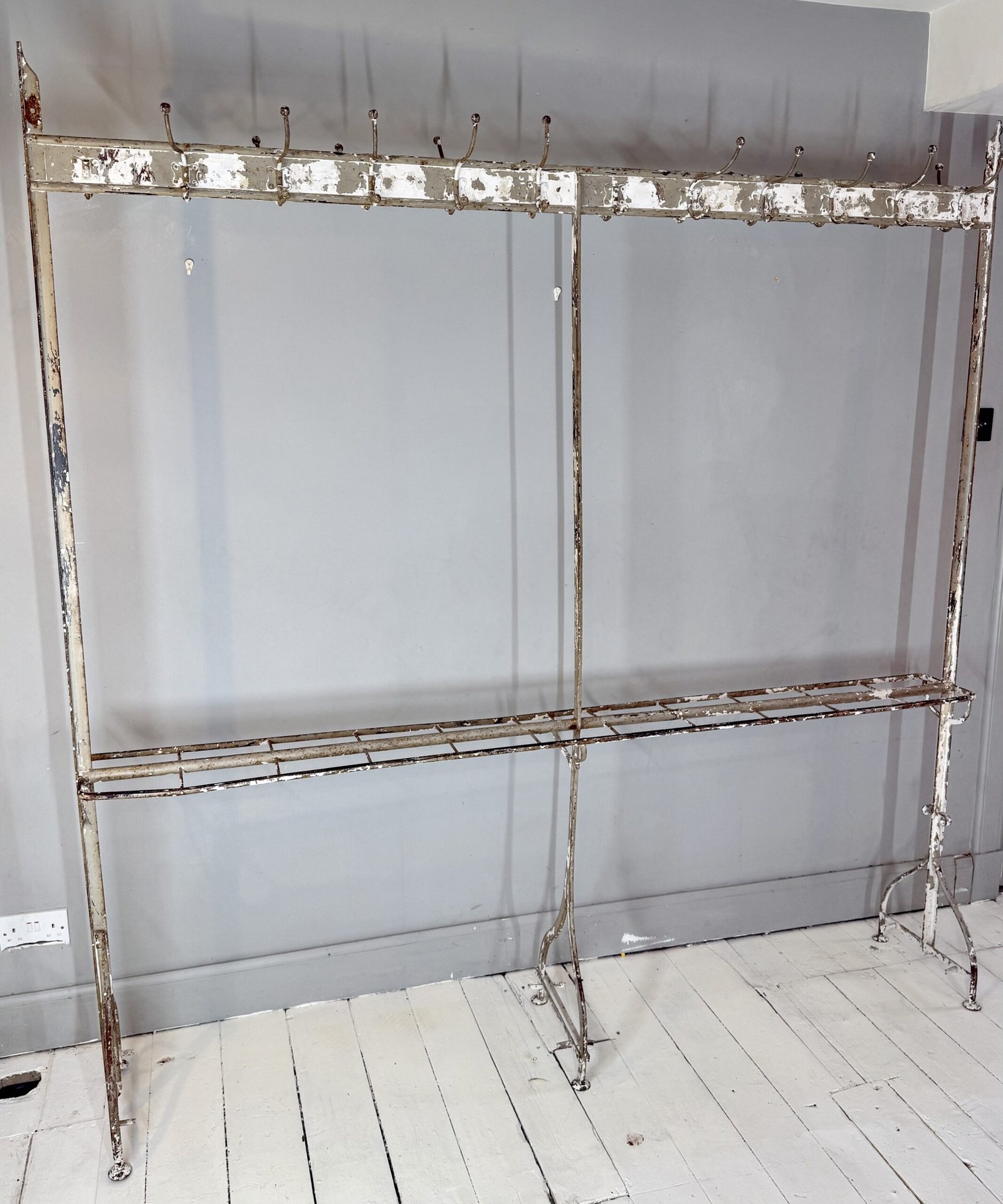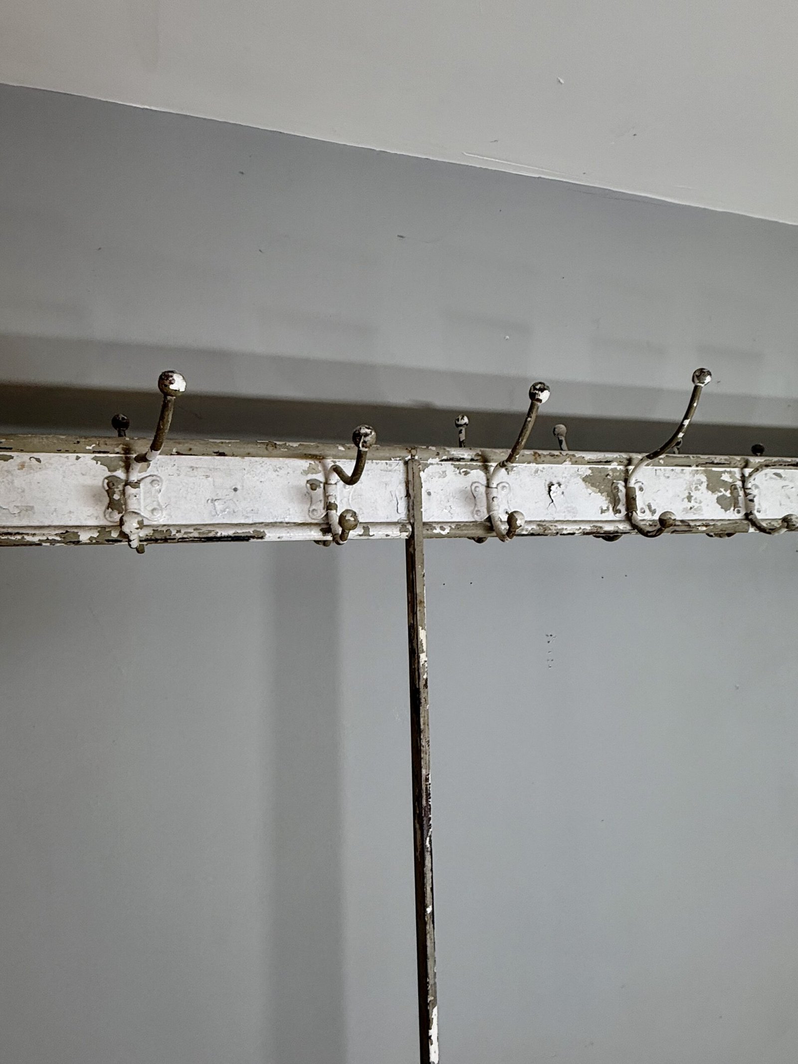 A one-of-a-kind antique hall stand from the late 19th or early 20th century, made of painted metal and featuring very large proportions. This stunning piece likely originates from Britain or France and was possibly used in a school, train station waiting room, or factory.