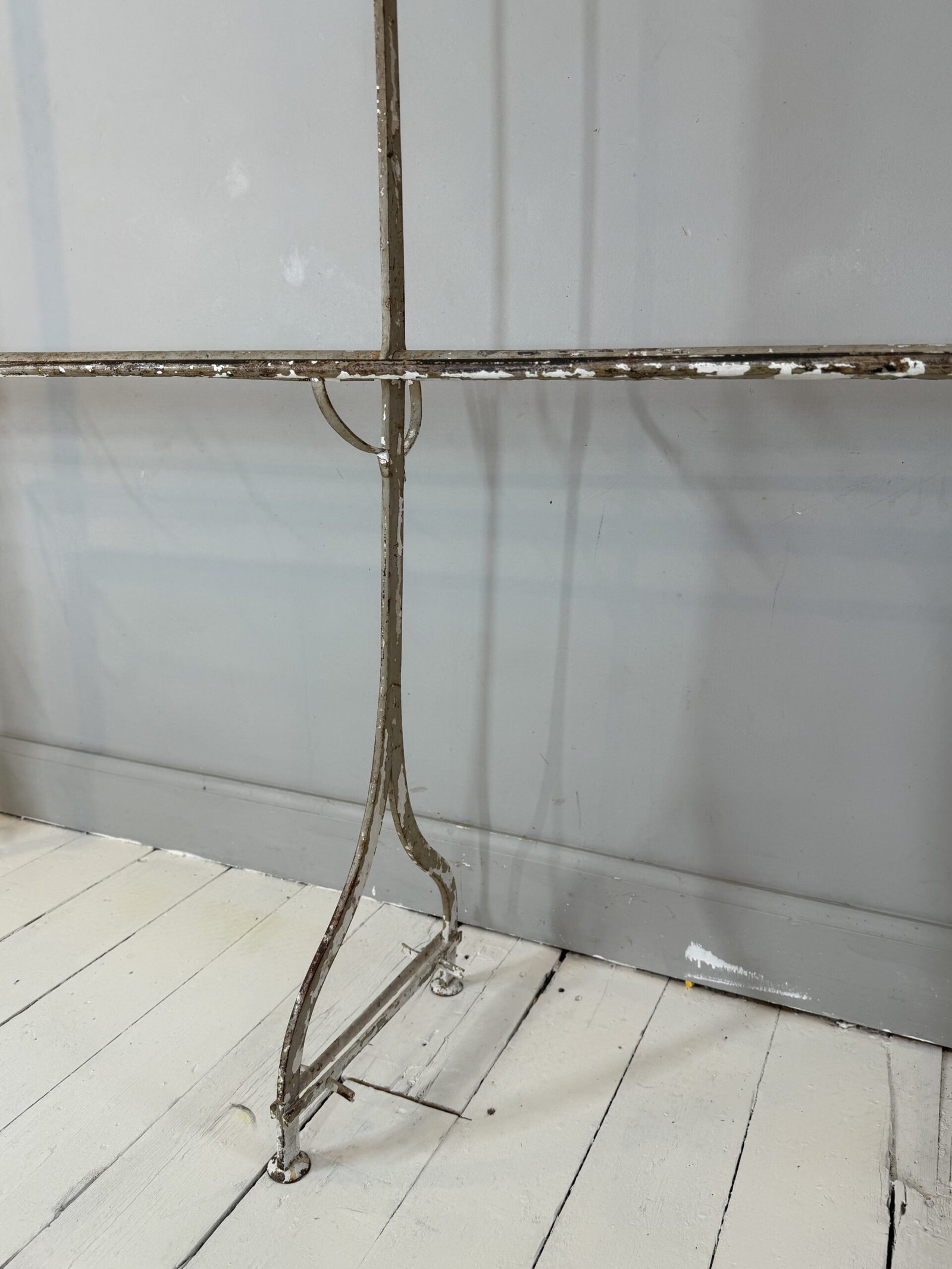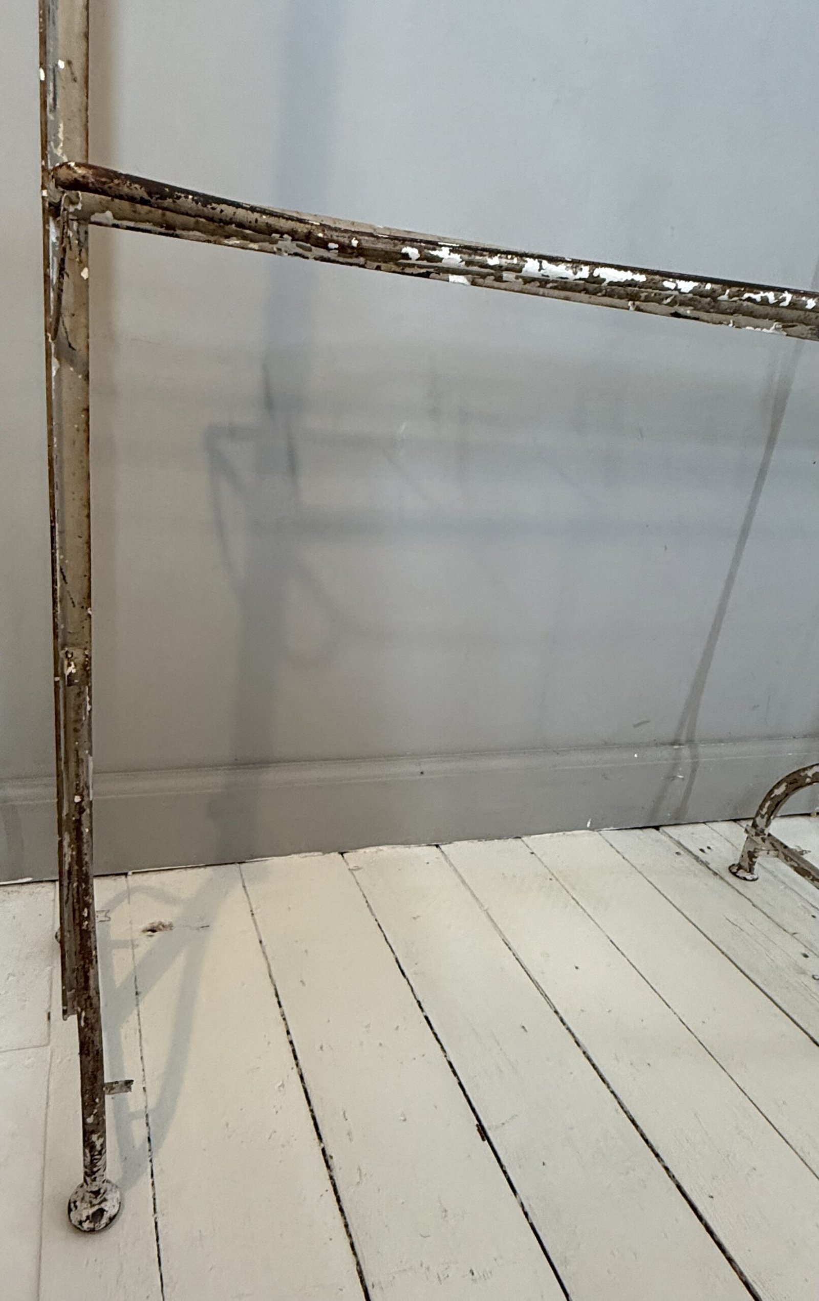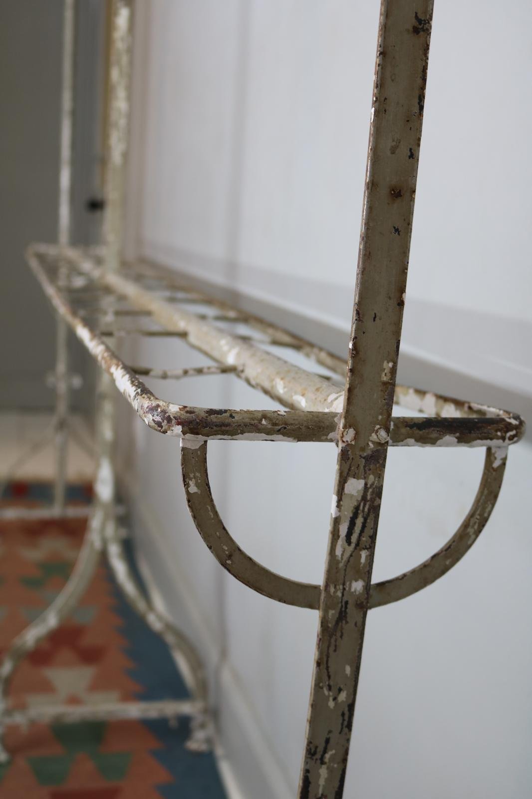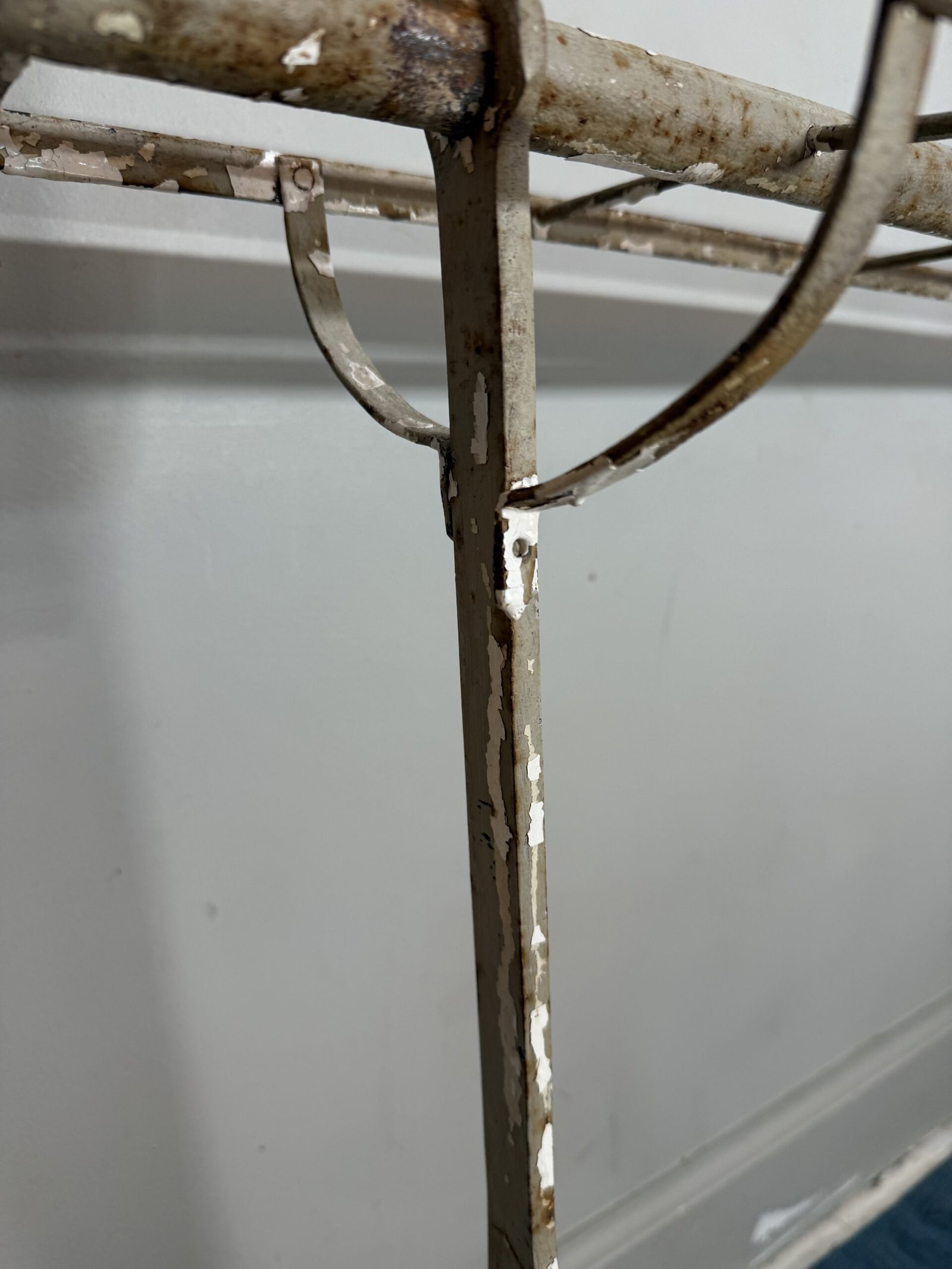 The stand retains its original distressed white paintwork, with areas of stone-grey metalwork showing through—perfect for a shabby chic aesthetic. Its impressive design and scale make it a true statement piece.