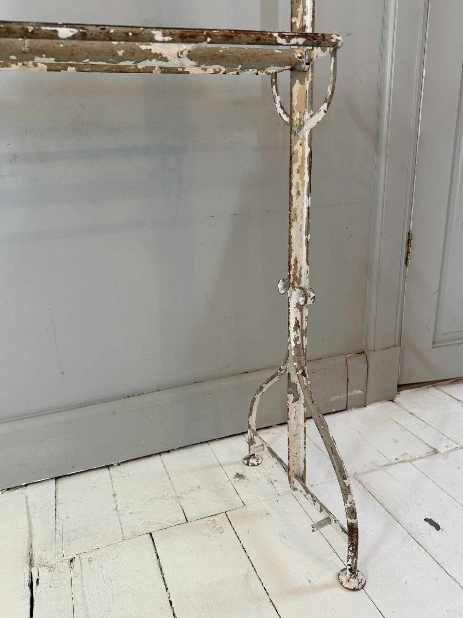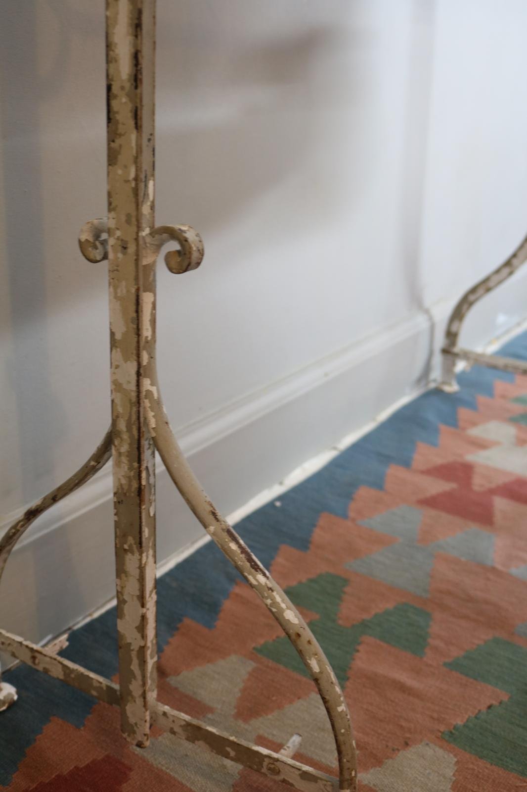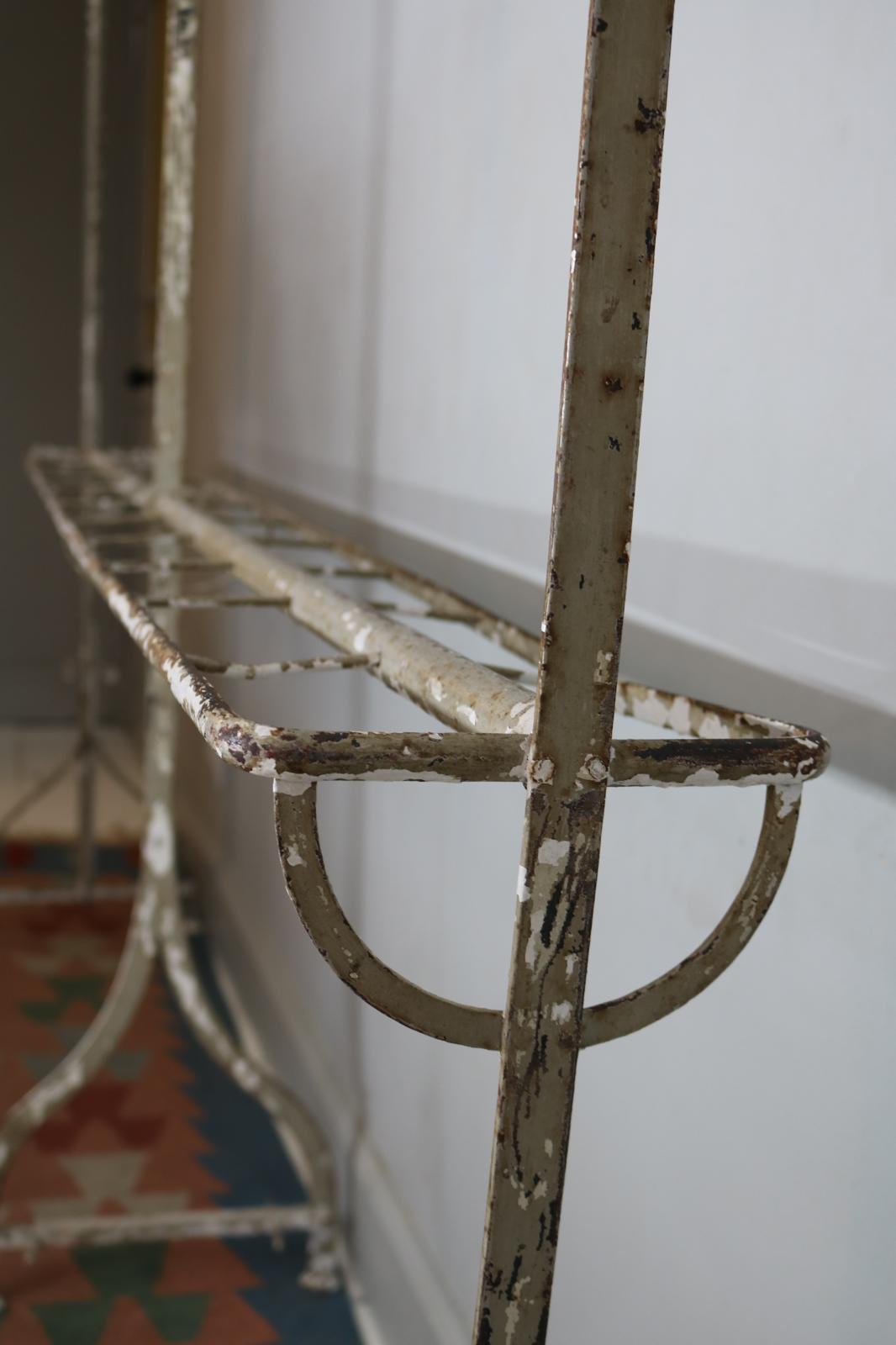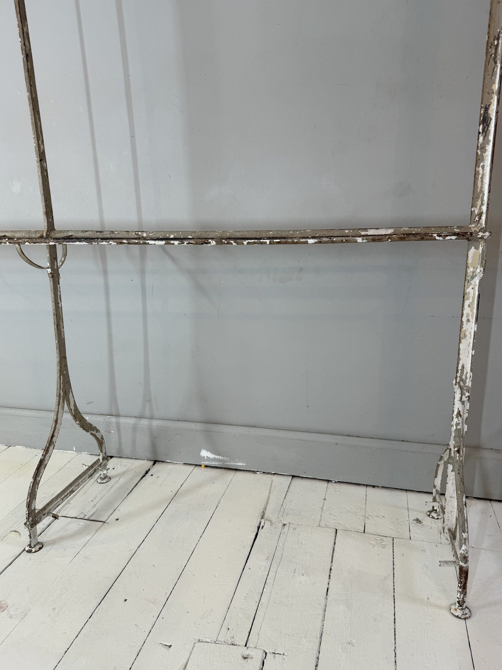 The stand retains its original distressed white paintwork, with areas of stone-grey metalwork showing through—perfect for a shabby chic aesthetic. Its impressive design and scale make it a true statement piece.